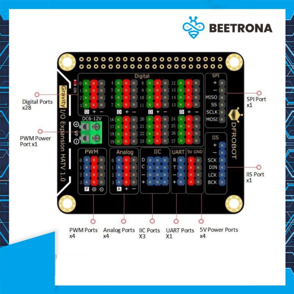 – Communication Interface: 28 digital Ports, 4 groups of analog port, 3 groups of IIC port, 1 group of UART, 4 groups of 5V power interfaces, 1 group of SPI, 1 group of IIS port